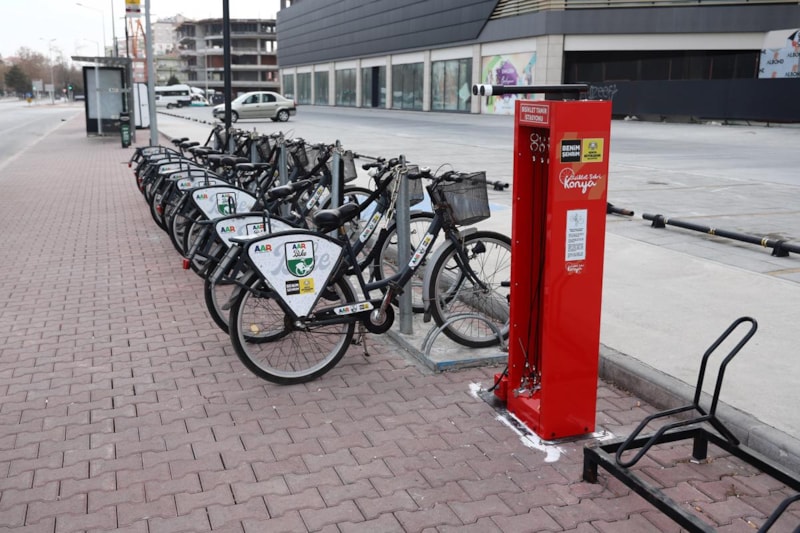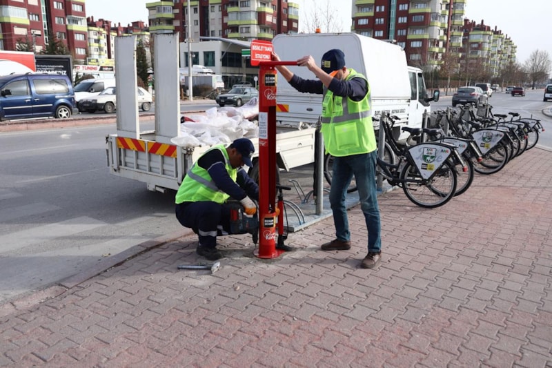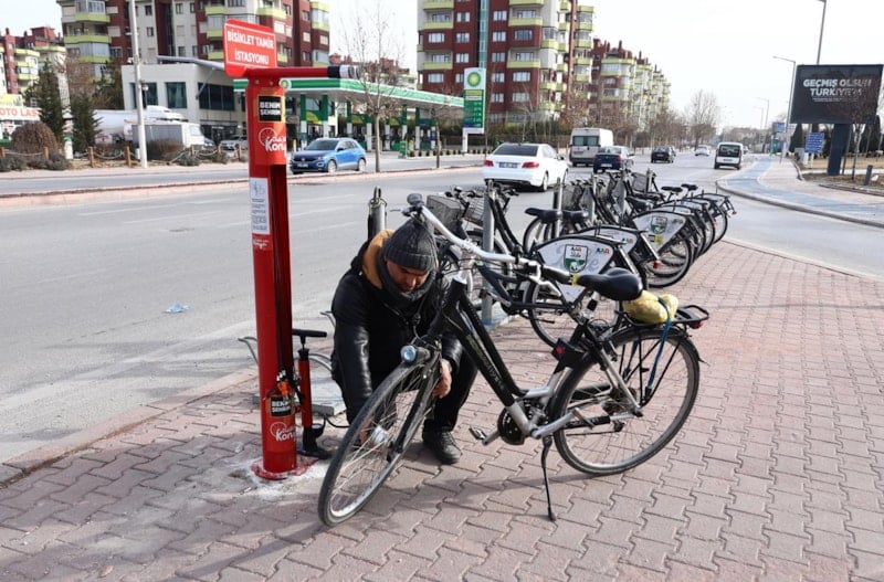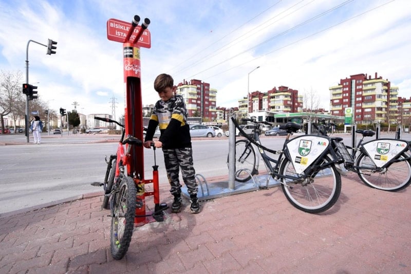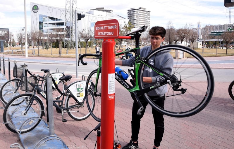 Konya Büyükşehir Belediyesi'nin 595 kilometrelik bisiklet yolunda, bisikletlerin tamir edilmesi için tamir istasyonları kurdu.