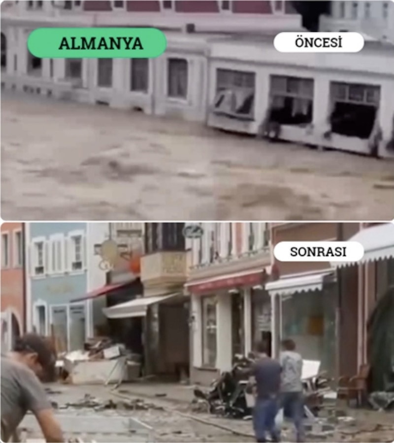 Aynı paylaşımda, buna karşılık, Almanya’da 2021’de Ahr Vadisi’nde meydana gelen sel felaketinin izlerinin hâlâ tam olarak silinememiş olması dikkat çekici bir karşılaştırma olarak öne çıktı.