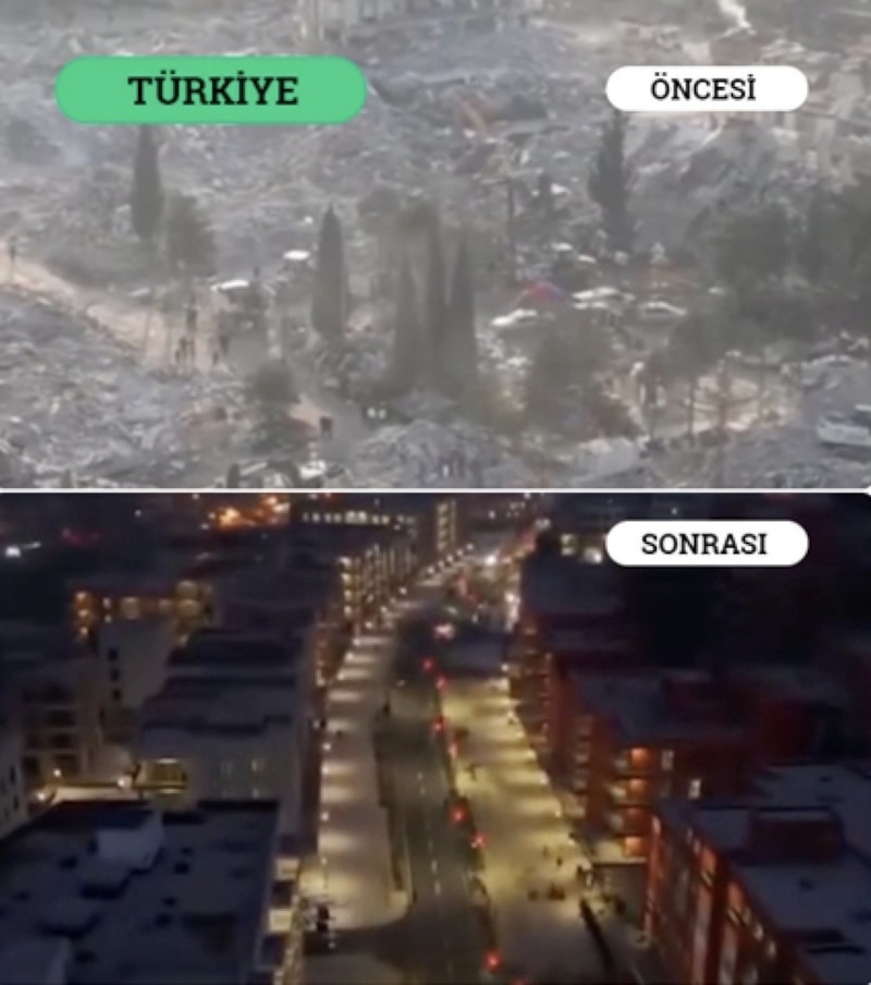 Almanya merkezli bir sosyal medya hesabı paylaşımına göre; Türkiye, 6 Şubat 2023’te Kahramanmaraş merkezli peş peşe yaşanan ve 11 ili etkileyen büyük depremlerin ardından hızlı bir şekilde organize olarak yaraları kısa sürede sarmaya başladı.