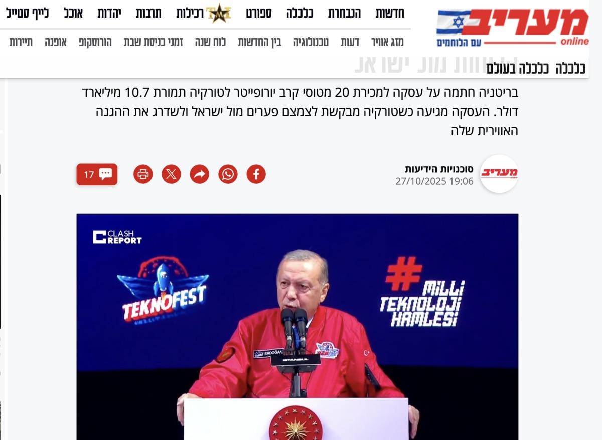İsrail gazetesi Maariv, Ankara'da imzalanan anlaşmaya ilişkin "Türkiye'nin, güç dengesini değiştirecek muazzam anlaşması" başlığını kullandı.