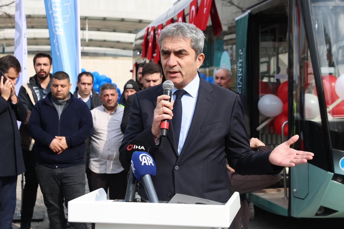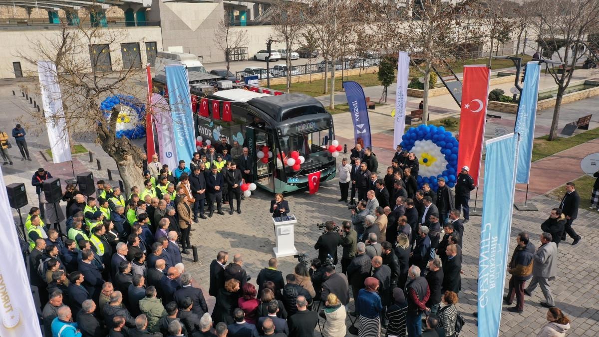 İstasyon Meydanı’nda yapılan tanıtımda, Karsan tarafından üretilen, yerli ve milli, sıfır emisyonlu, çevreci hidrojenle çalışan otobüsler, bir depoda 500 kilometre yol katederken yüksek yolcu kapasitesi ve konforuyla ön plana çıkıyor.