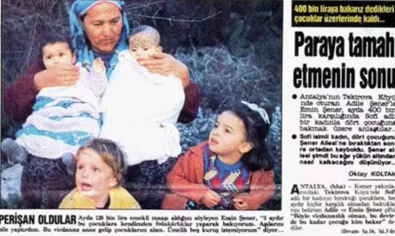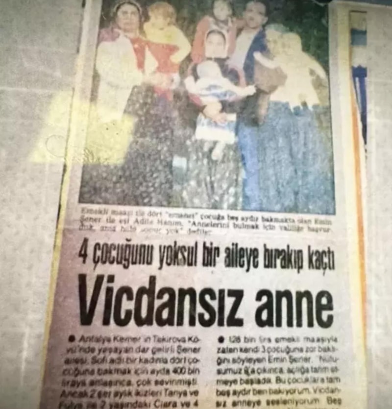 “Antalya’nın Tekirova Köyü’nde oturan Adile Şener’le Emin Şener, ayda 400 bin lira karşılığında Sofia adlı bir kadınla dört çocuğuna bakmak üzere anlaştılar. Sofia isimli kadın, dört çocuğunu Şener Ailesi’ne bıraktıktan sonra ortadan kayboldu. Yener ailesi şimdi bu ağır yükün altından nasıl kalkacağını düşünüyor.”