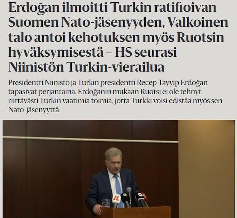 Helsingin Sanomat gazetesi, "Erdoğan, Türkiye'nin Finlandiya'nın NATO üyeliğini onaylayacağını açıkladı." diye yazdı.