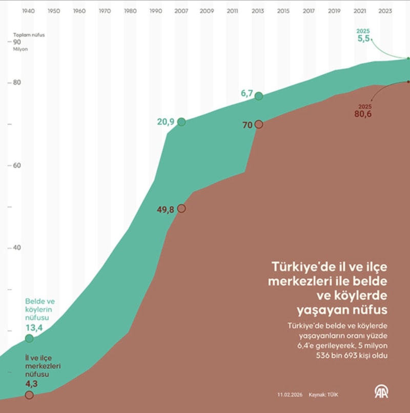 Türkiye'de nüfusun yüzde 93,6'sı il ve ilçe merkezlerinde ikamet ederken belde ve köylerde yaşayanların oranı yüzde 6,4'e gerileyerek, 5 milyon 536 bin 693 kişi oldu.
