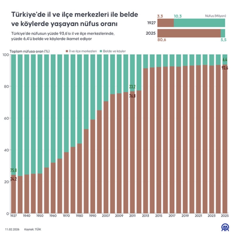 Toplam nüfus içinde il ve ilçe merkezlerinde ikamet edenlerin oranı 2024'te yüzde 93,4 iken 2025'te yüzde 93,6'ya yükseldi.