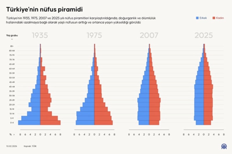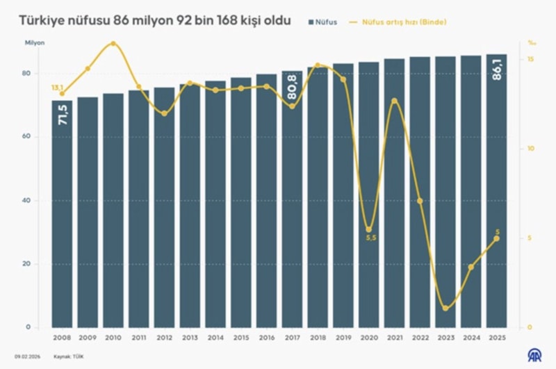 Türkiye İstatistik Kurumu (TÜİK), ülke nüfusunun 2025'te, bir önceki yıla kıyasla 427 bin 224 kişi artarak 86 milyon 92 bin 168 kişi olduğunu açıkladı.