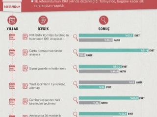 Türkiye en son referandumunu ise 12 Eylül 2010'da yaptı. Bu referandumda seçmen 26 maddelik değişiklik paketi için sandığa gitti. Oy kullanan seçmenlerin 57,9'u "evet" ve yüzde 42,1'i ise "hayır" oyu verdi. Böylece, Anayasa Mahkemesi ve Hakimler ve Savcılar Yüksek Kurulunun (HSYK) yeniden yapılandırılması, memura toplu sözleşme hakkı, askere sivil mahkeme yolunun açılması, kişisel verilerin korunması ve Yüksek Askeri Şura (YAŞ) kararlarının yargıya açılmasının da aralarında olduğu değişiklikler onaylandı.