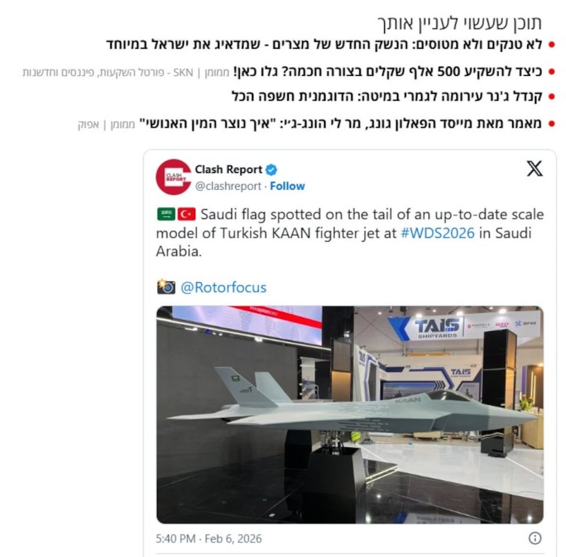 İsrail’de yayımlanan Maariv gazetesi, Türkiye ile Suudi Arabistan arasında olası bir savunma anlaşmasının İsrail’de endişeyle takip edildiğini yazdı. Gazeteye göre anlaşma, 20 ila 100 adet KAAN savaş uçağının yanı sıra Gökbey çok amaçlı helikopter alımını da kapsayabilir.