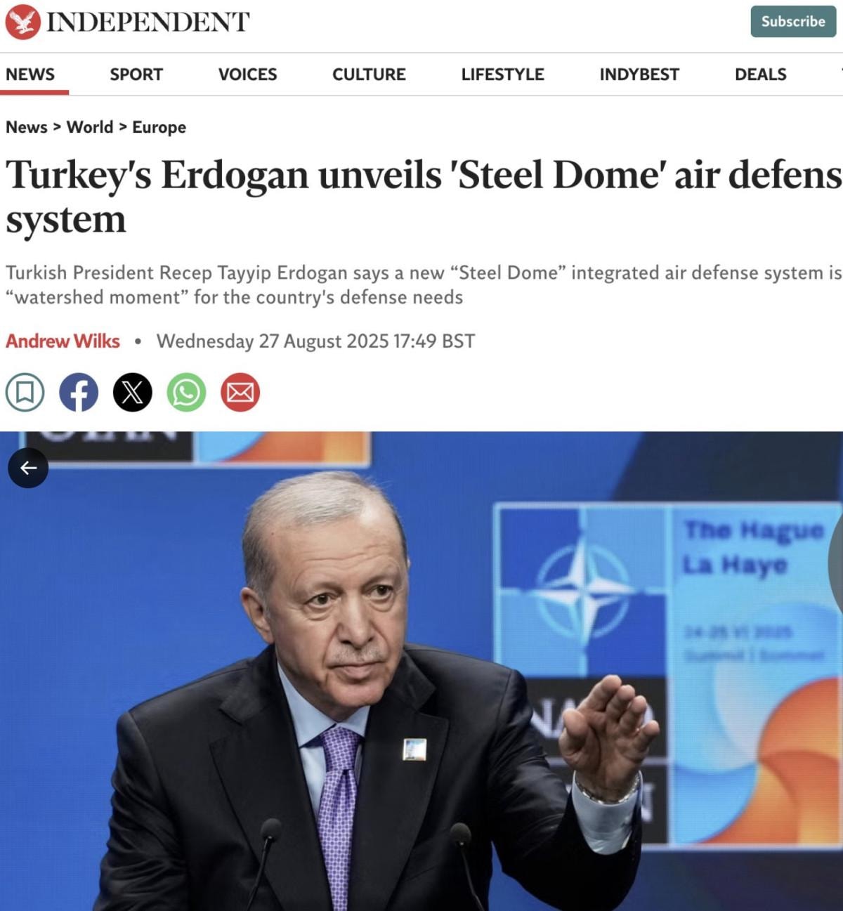 The Times of Israel gazetesi, "Erdoğan, Türkiye'nin kendi 'Çelik Kubbe' hava savunma sisteminin askerlerine teslim edildiğini duyurdu." ifadesini kullandı.