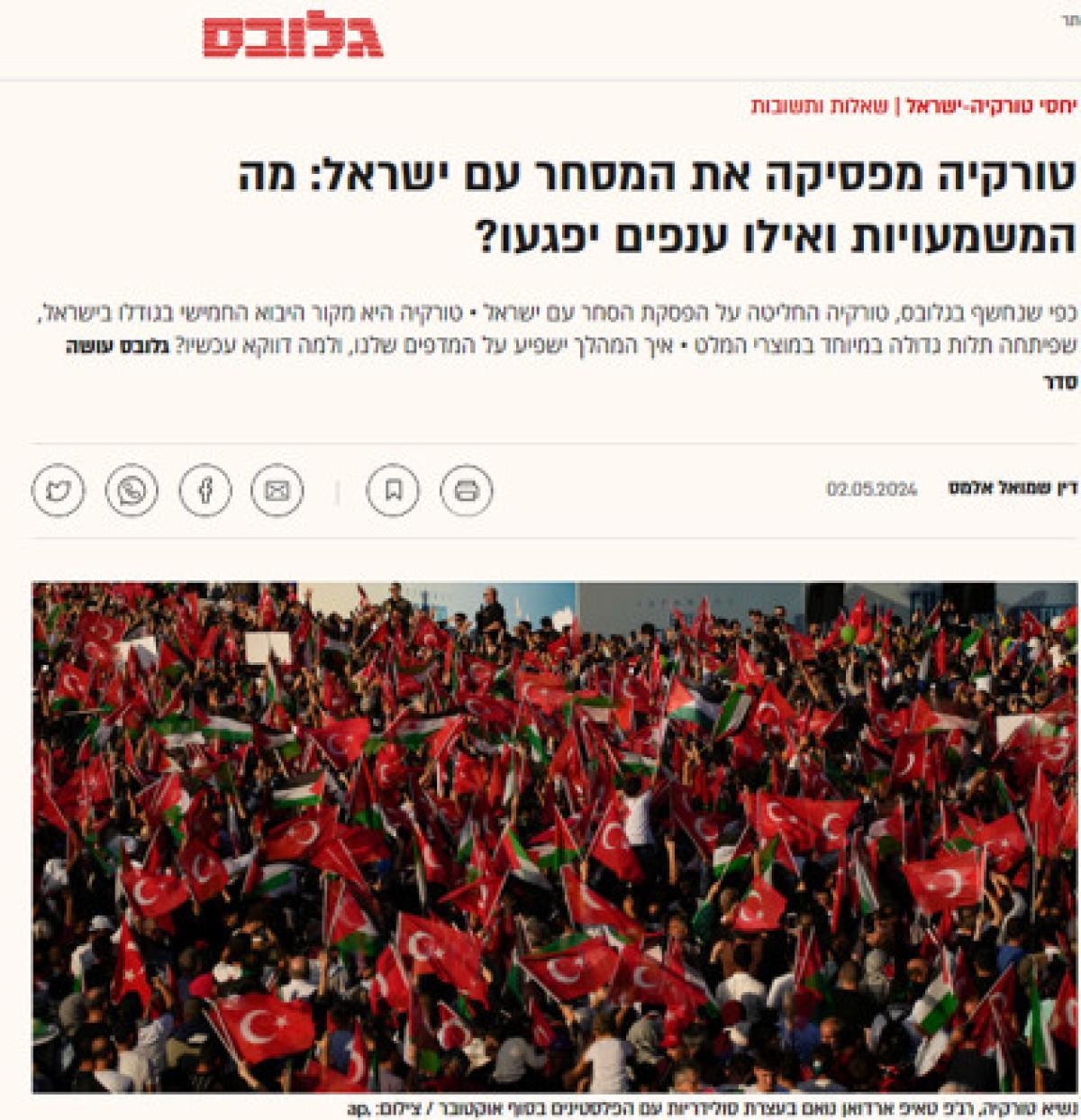 İsrail'in Ynet gazetesi haberi "Türkiye'nin ekonomik boykotu kaldırma şartı: Gazze'de tam ateşkes" başlığıyla yayınlarken, haberde ambargonun ekonomik zarara dikkat çekildi.