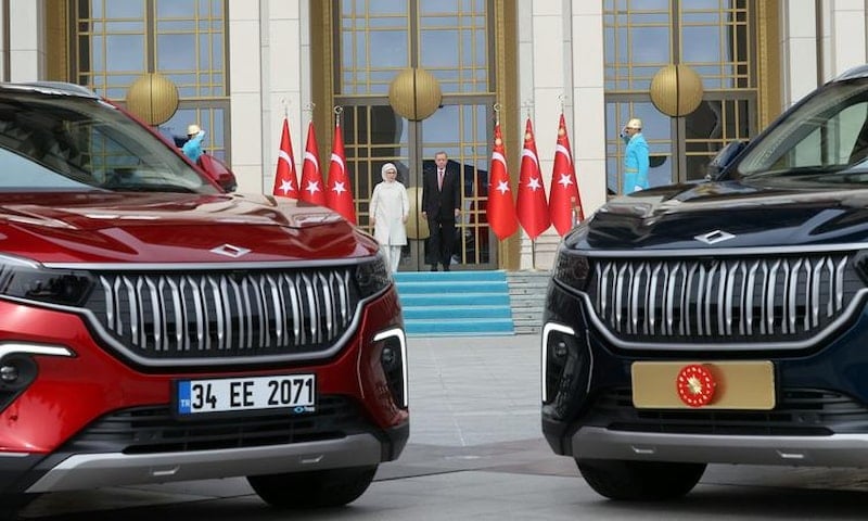 Törende, Cumhurbaşkanı Recep Tayyip Erdoğan, eşi Emine Erdoğan ile "Anadolu" renkli Togg'a binerek Cumhurbaşkanlığı Külliyesi etrafında test sürüsü yaptı.