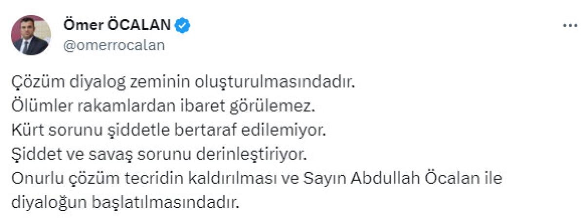 Partinin Şanlıurfa Milletvekili Ömer Öcalan, sosyal medya hesabından yaptığı paylaşımda şu ifadelere yer verdi: