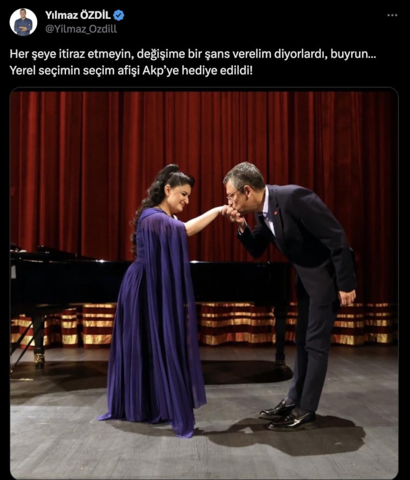 Özdil, "Her şeye itiraz etmeyin, değişime bir şans verelim diyorlardı, buyrun… Yerel seçimin seçim afişi AK Parti’ye hediye edildi!" yorumunu yaptı.
