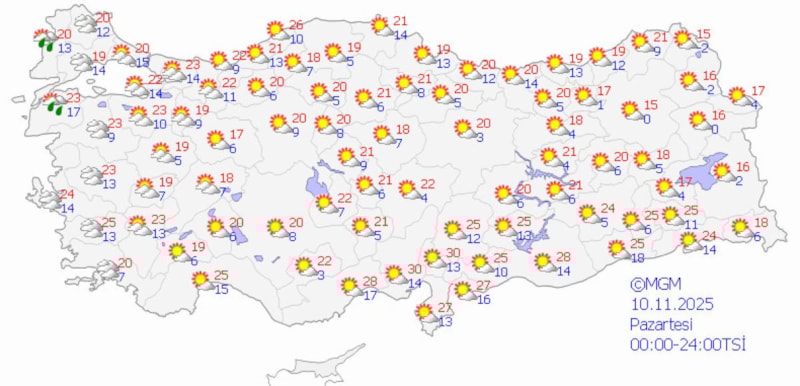 10 Kasım Pazartesi günü, ülke genelinde parçalı ve az bulutlu hava etkili.