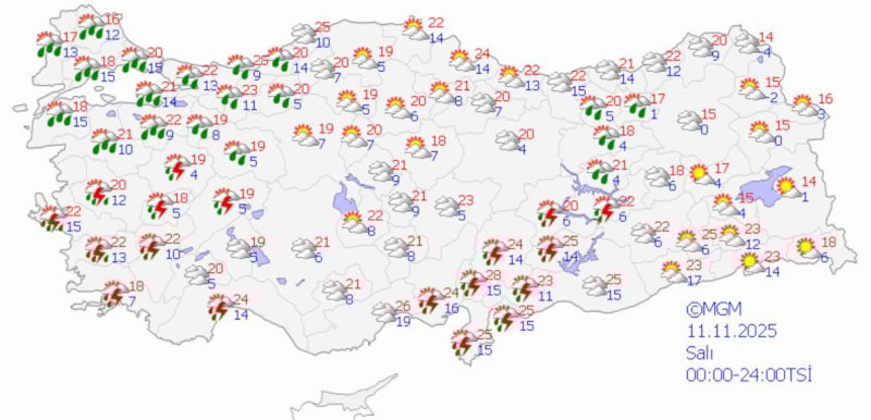 11 Kasım Salı günü yağışlar yoğunlaşacak; Batı Ege ve Marmara'nın iç kesimleri gök gürültülü sağanak alacak.