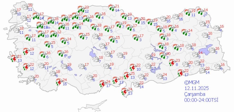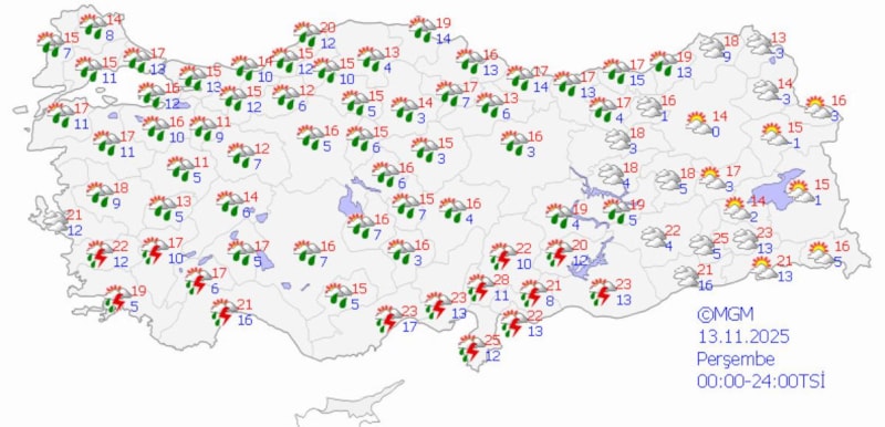 13 Kasım Perşembe günü yağışlar azalacak ancak Ege kıyıları ve Akdeniz'in yer yer sağanaklı olacağı tahmin ediliyor.