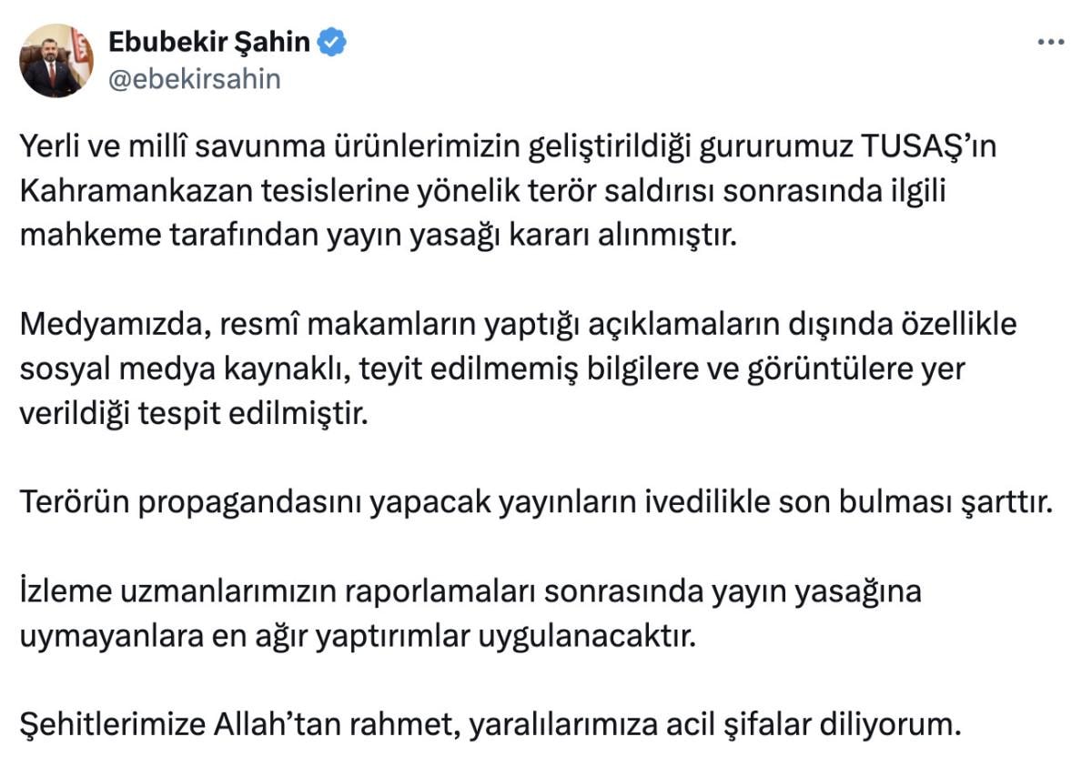Radyo ve Televizyon Üst Kurulu (RTÜK) Başkanı Ebubekir Şahin, sosyal medya hesabı üzerinden TUSAŞ'ın Kahramankazan tesislerine yönelik terör saldırısı sonrasında konan yayın yasağına dair kararı paylaştı.