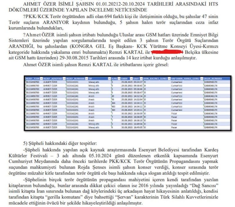 Şahıs hakkında 23.11.2023-23.01.2024 tarihleri arasında CMK 135 tedbiri kapsamında 2 Adet suç unsuru görüşmenin bulunduğu, görüşme içeriğinde karşı hedefin Ahmet ÖZER’i arayarak Mehmet KAYA isimli şahsın annesinin öldüğünü söylediği, Ahmet ÖZER isimli şahsında karşı hedeften Mehmet KAYA isimli şahsın numarasını isteyerek parti içerisindeki konumunu sorduğu, karşı şahsın ise Mehmet KAYA'nın iki kardeşinin dışarda (örgütün kırsal alanını kastetmiştir) olduğunu, bir kardeşinin ise cezaevinde bulunduğunu, bu nedenle Mehmet KAYA'ya partinin değer verdiğini ve şahsı ziyaret etmesini istediği, Akabinde Ahmet ÖZER'in Mehmet KAYA isimli şahsı arayarak başsağlığında bulunduğu ve yerel seçimlerde kendisinin yardımına ihtiyacının olduğunu söylediği tespit edildiği, bu hususta şüpheli Ahmet Özer’in terör örgütüyle bağını gösterir en önemli telefon görüşmesine aşağıda yer verilmiştir: