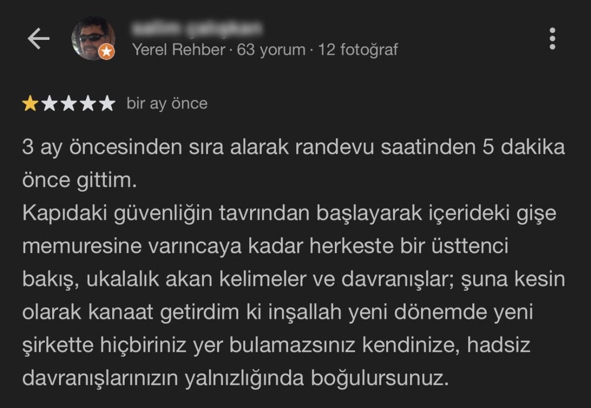 3 ay öncesinden sıra alarak randevu saatinden 5 dakika önce gittim. Kapıdaki güvenliğin tavrından başlayarak içerideki gişe memuruna varıncaya kadar herkeste üsttenci bir bakış, ukalalık akan kelimeler ve davranışlar vardı; şuna kesin olarak kanaat getirdim ki inşallah yeni dönemde, yeni şirkette hiçbiriniz kendinize yer bulamazsınız; hadsiz davranışlarınızın yalnızlığında boğulursunuz.