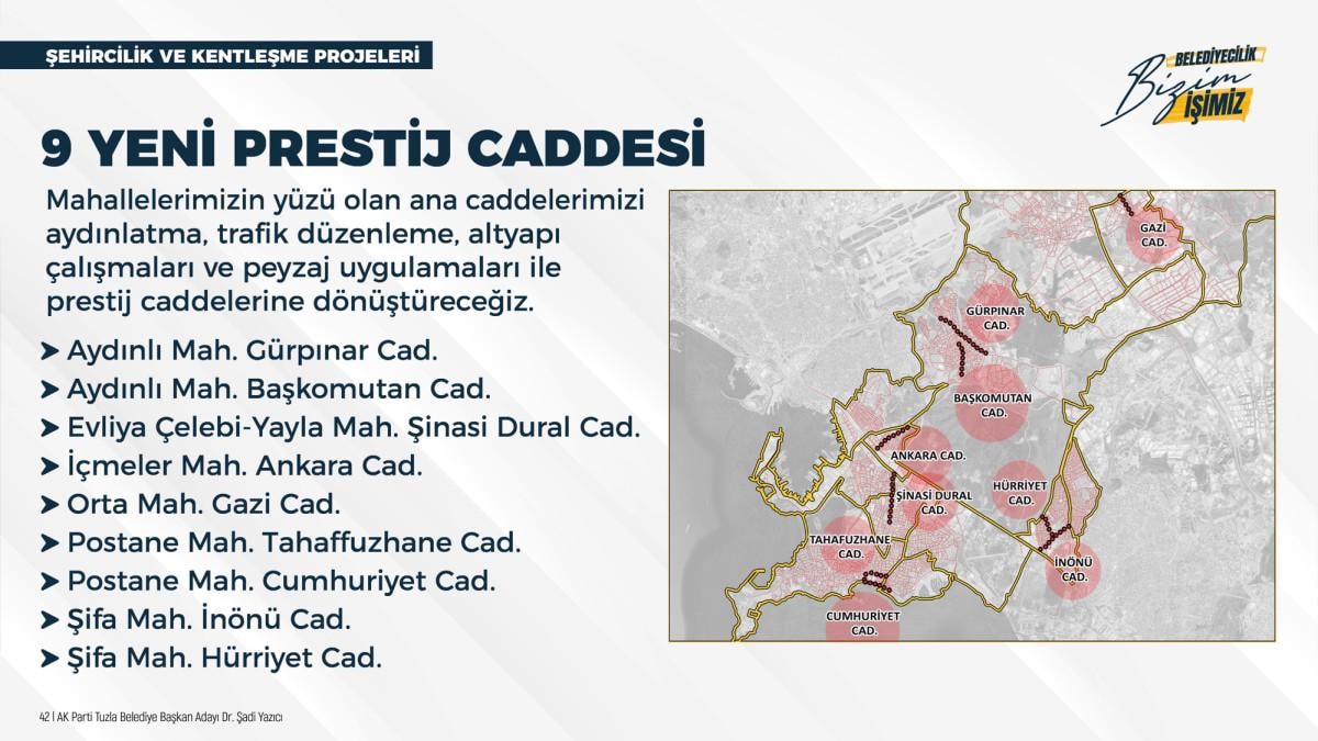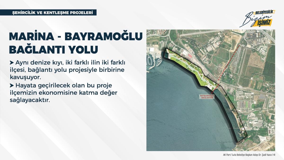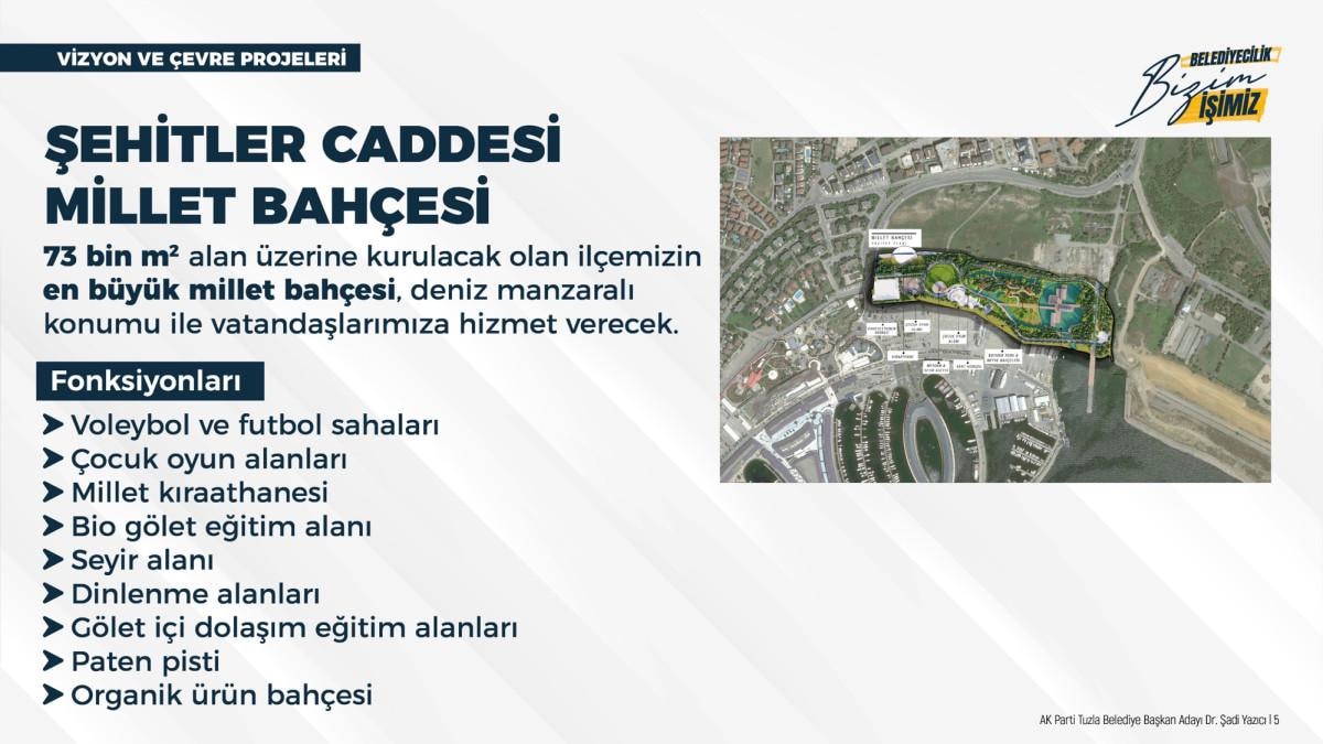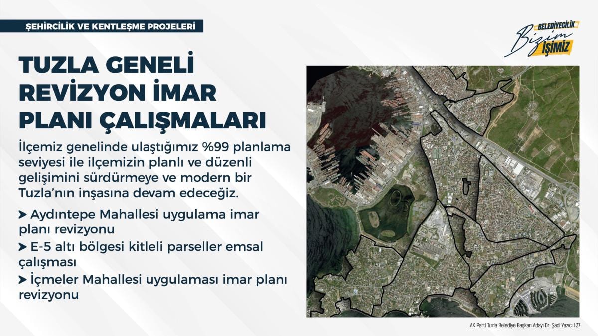 Başkan Şadi Yazıcı, “Daha önce projeleri tamamlanmış, yatırımına başlanmış işleri ısrarla takip ettik. Tavşantepe - Tuzla Metrosu, Sebze ve Meyve Hali, Hacet Deresi, Hünkar Çayırı Bağlantı Yolu, Aydıntepe Sabiha Gökçen Bağlantı Yolu, Kamil Abdüş Gölü Çevre Düzenlemesi, Benim Köyüm Benim Çiftliğim Projesi, Arıtma Tesisi Koku Giderme Ünitesi. İstediğimiz sadece bunların yapılmasıydı. Bunların İstanbul Büyükşehir Belediyesi tarafından yapılması Tuzla’nın hakkıydı.