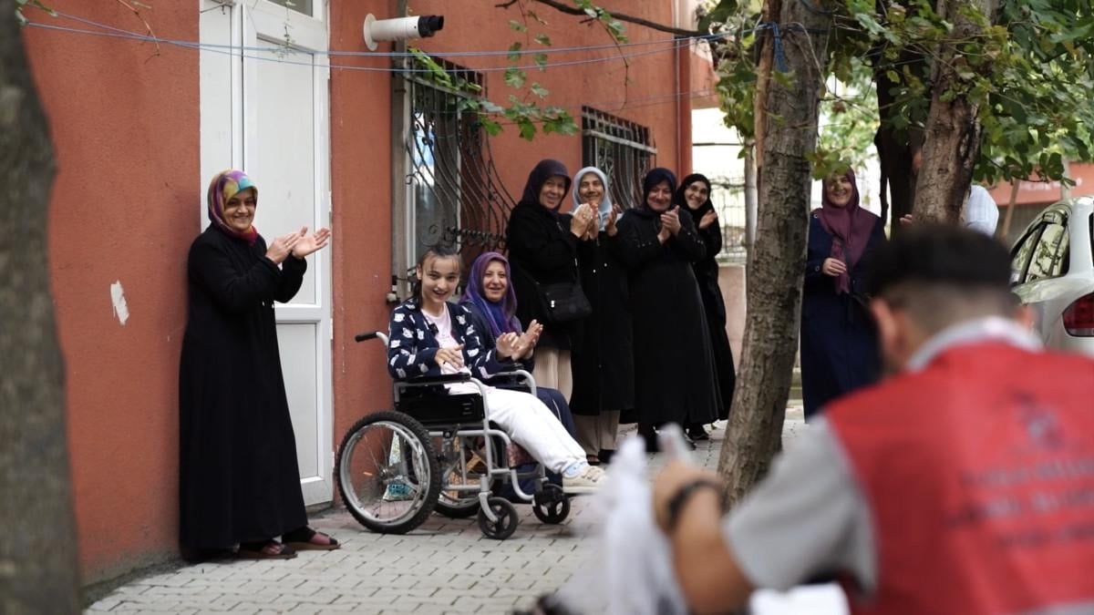 Evlerinin önünde komşularıyla akülü aracını bekleyen Semanur, belediye ekiplerinin getirdiği aracına alkışlar eşliğinde bindi.