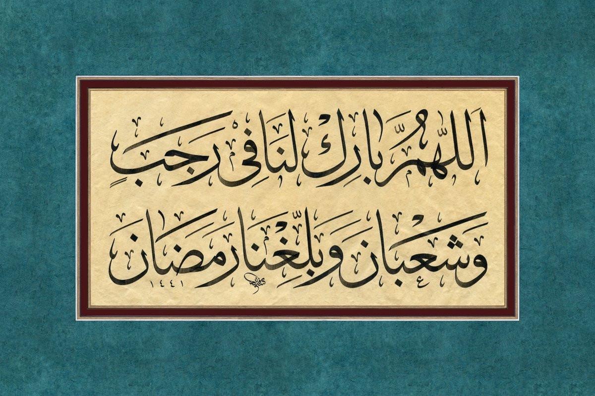 (Hz. Peygamber’in receb ayı girdiğinde yaptığı rivayet edilen dua: “Allahım! Receb ve şâbanı bize mübarek kıl ve bizi ramazana ulaştır!” Hat: Fatih Özkafa)