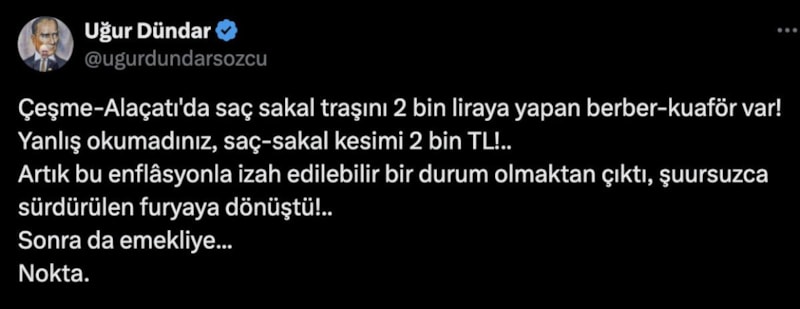 Gazeteci Uğur Dündar Çeşme-Alaçatı'da saç sakal tıraşının 2 bin TL olmasına tepki göstererek, "Artık bu enflasyonla izah edilebilir bir durum olmaktan çıktı, şuursuzca sürdürülen furyaya dönüştü." dedi.