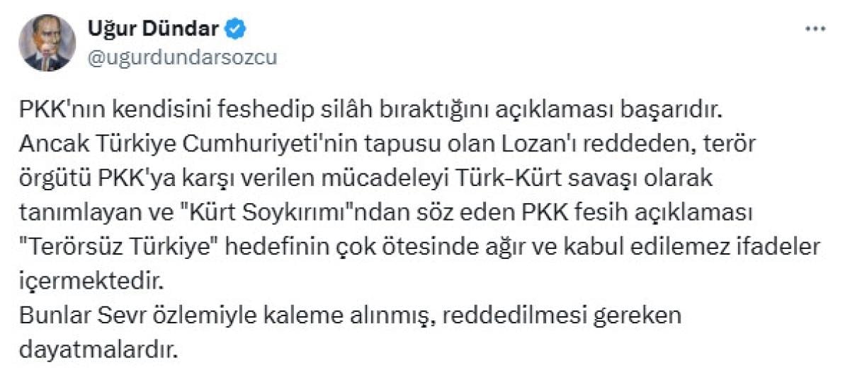Ancak Türkiye Cumhuriyeti'nin tapusu olan Lozan'ı reddeden, terör örgütü PKK'ya karşı verilen mücadeleyi Türk-Kürt savaşı olarak tanımlayan ve "Kürt Soykırımı"ndan söz eden PKK fesih açıklaması "Terörsüz Türkiye" hedefinin çok ötesinde ağır ve kabul edilemez ifadeler içermektedir.