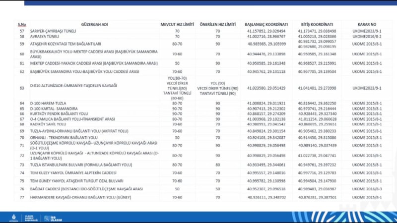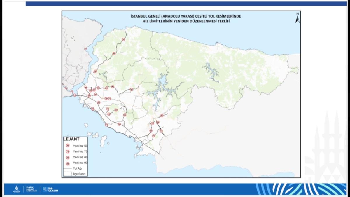 D-100 Büyükçekmece Mimar Sinan Kavşağı- Beylikdüzü (TÜYAP), D-100 Büyükçekmece Beylikdüzü (TÜYAP) - Altunizade Köprülü Kavşağı, D-100 Harem-Tuzla ,D-100 Kartal- Samandıra'da, tünellerde de Sarıyer-Çayırbaşı Tüneli, Avrasya tüneli, Tantavi Tüneli, Vecdi Diker Tüneli, Halit Ulukurt Tüneli'nde hız sınırları yeniden belirlendi.