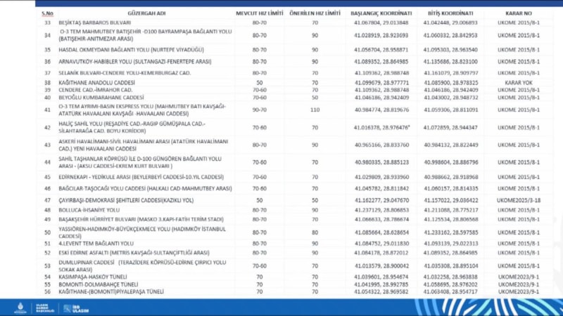 UKOME Kasım ayı toplantısında Avrupa Yakası'nda 57 noktada, Anadolu Yakası'nda da 27 güzergahta olmak üzere toplam 84 güzergahta hızlar yeniden düzenlendi. Takvime göre 31 Aralık 2025 tarihine kadar saha çalışmalarının tamamlanması bekleniyor.