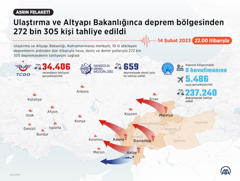 Ulaştırma ve Altyapı Bakanlığı, 9 gün boyunca hava, deniz ve demir yolları vasıtasıyla deprem bölgelerinden alınarak başka illere taşınan kişi sayısını paylaştı.