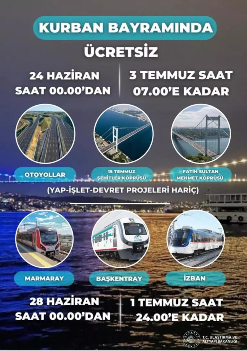 Ulaştırma ve Altyapı Bakanı Abdulkadir Uraloğlu, "Köprü ve otoyol ücretleri Cumhurbaşkanımız Erdoğan tarafından bayram süresince ücretsiz yapıldı. Marmaray, Başkentray, İzban ücretsiz olacak. Uzun Trafik kuyruklarının oluşmasını engelleyeceğiz" dedi.