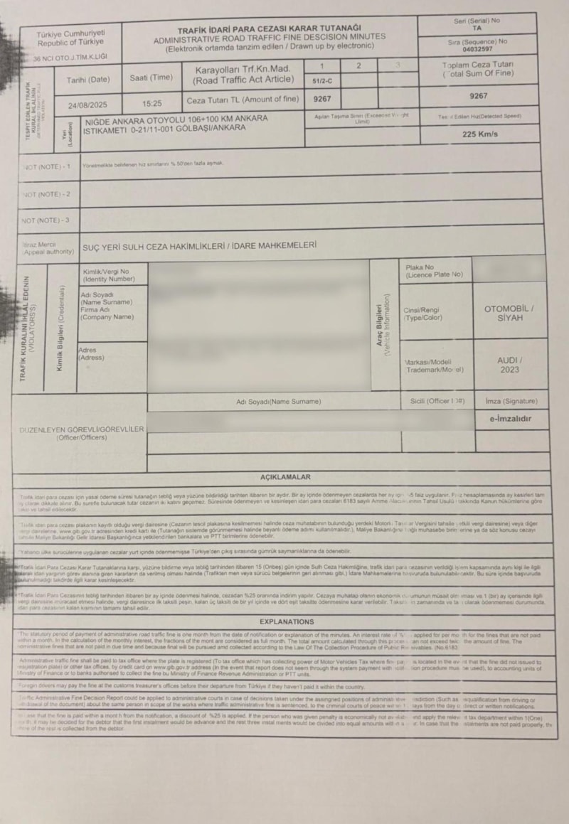 Ankara-Niğde Otoyolu test sürüşünde 225 kilometre hıza çıkan Ulaştırma ve Altyapı Bakanı Abdulkadir Uraloğlu, kendisine kesilen cezayı paylaştı. Uraloğlu, "Hız sınırlarına riayet etmek herkes için zorunlu bir durumdur" dedi.