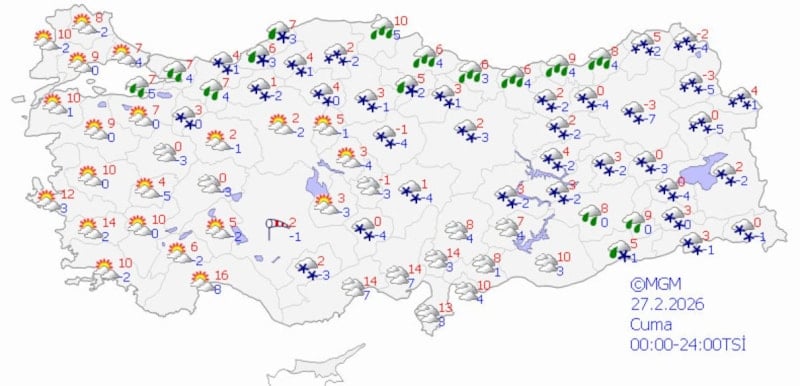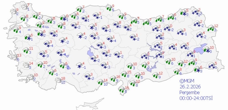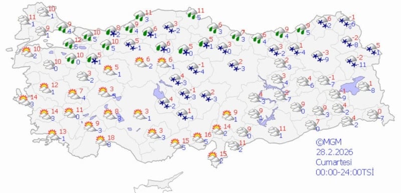 Ege kıyıları ile Antalya çevresi hariç aralıklı yağmur ve sağanak, diğer yerlerde karla karışık yağmur ve kar şeklinde yağışlar öngörülüyor.