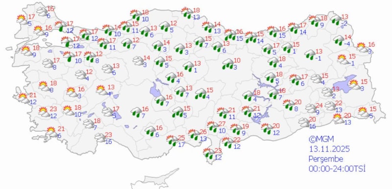 Meteoroloji Genel Müdürlüğü'nden alınan tahminlere göre, hava sıcaklığı iç ve doğu kesimlerde 2 ila 4 derece azalacak, diğer yerlerde önemli bir değişiklik olmayacak.
