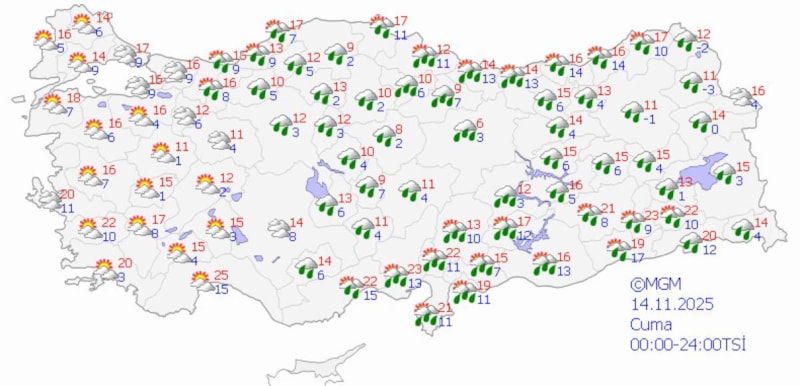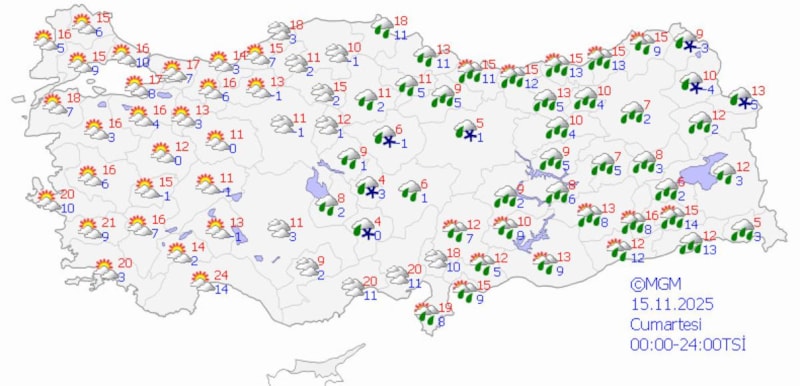 Ülkemiz genelinde yağmurlu bir hava hakim olacak. Özellikle Marmara, Akdeniz ve Karadeniz bölgelerinde sağanak yağış bekleniyor. Doğu Anadolu'da ise yer yer kar yağışı görülebilir.