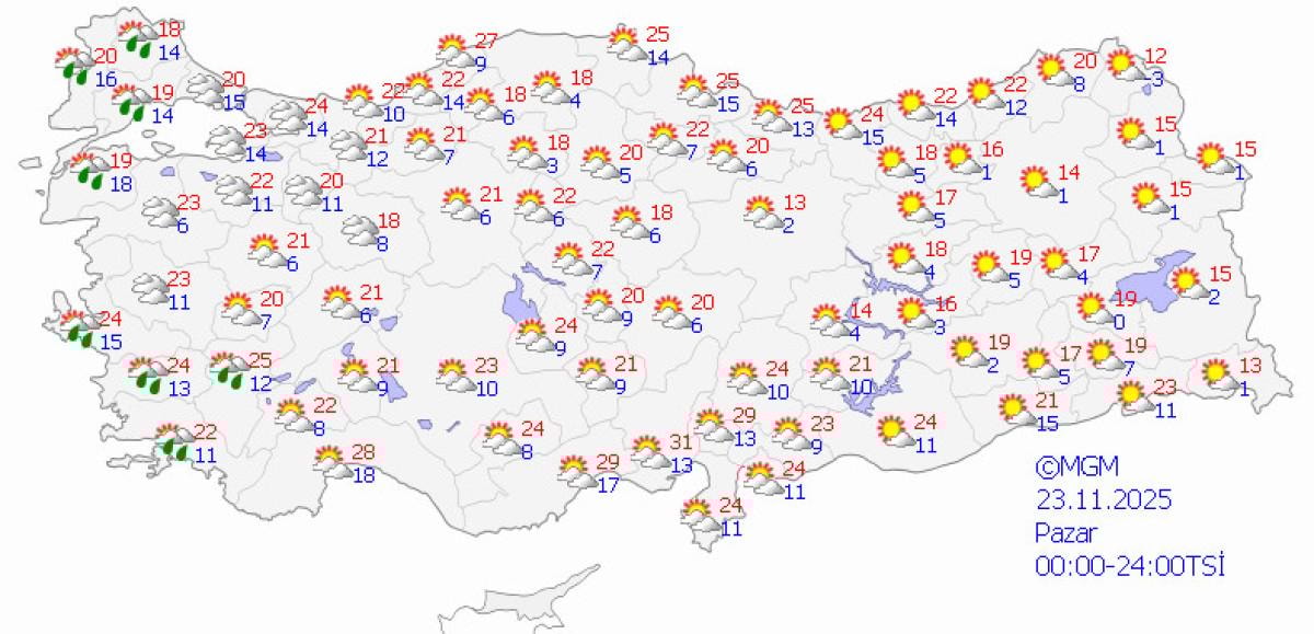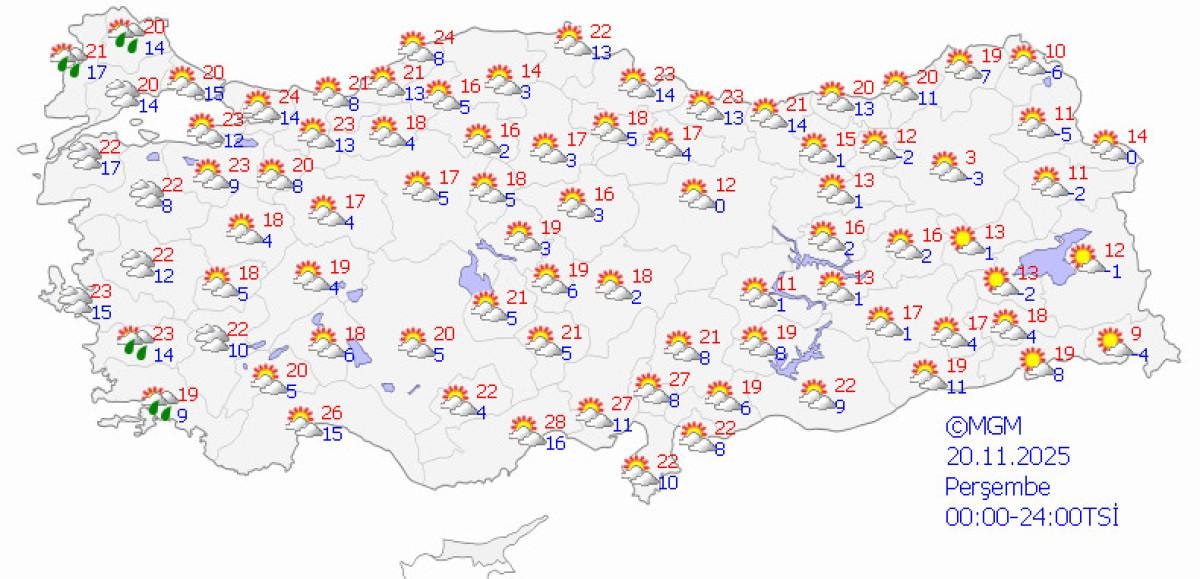 Meteoroloji Genel Müdürlüğü'nün (MGM) verilerine göre sıcaklık kuzey ve iç kesimlerde mevsim normallerinin hafif üzerinde, diğer bölgelerde ise normallere yakın sıcaklıklar hakim olacak.