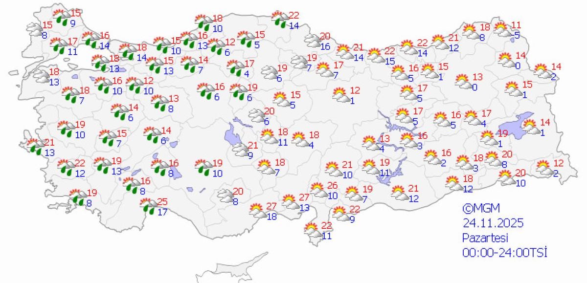 Pazar günü parçalı bulutlu hava artarken, Pazartesi günü ise batı kesimlerde bulutlanma ve hafif yağış ihtimali yükselecek, sıcaklıklar 20 dereceye gerileyecek.