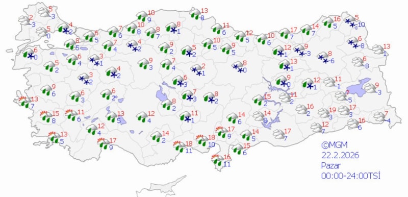 Meteoroloji Genel Müdürlüğü'nün son verilerine göre Türkiye'de sıcaklıkların düşük seyretmesi bekleniyor. Yağışların, kar, karla karışık yağmur ve yağmur olarak etkisini sürdüreceği tahmin ediliyor.