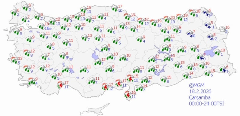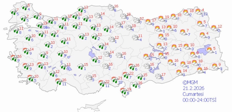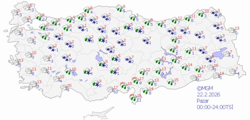 Güneydoğu Anadolu ve Akdeniz'in bazı bölgelerinde daha yüksek sıcaklıklar ve güneşli aralıklar devam ederken Karadeniz, İç Anadolu, Doğu Anadolu ve Marmara'da kar yağışı ihtimali yüksek olarak değerlendiriliyor.