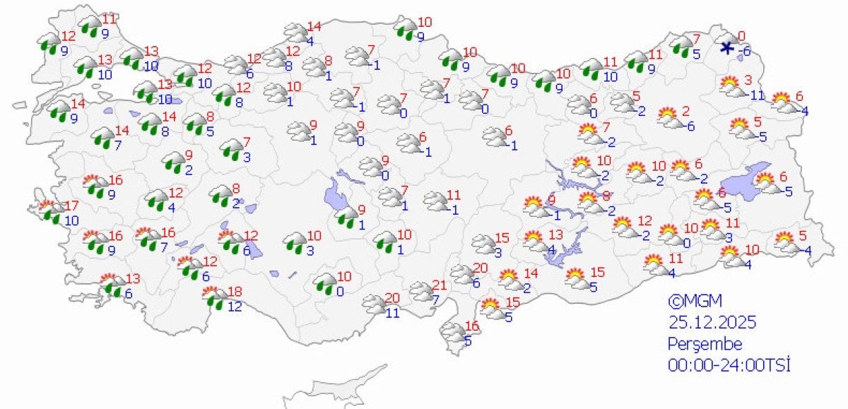 Güneyde yağmurun etkili olacağı tahmin edilirken, batıda parçalı bulutlu ve güneşli bir hava öngörülüyor.
