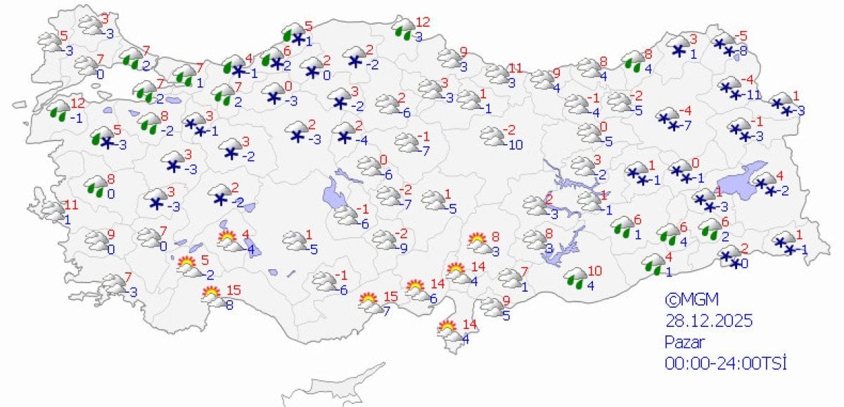 Özellikle iç ve doğu kesimlerde kar yağışı etkili olurken, kıyı bölgelerde yağmur ve parçalı bulutlu hava bekleniyor.