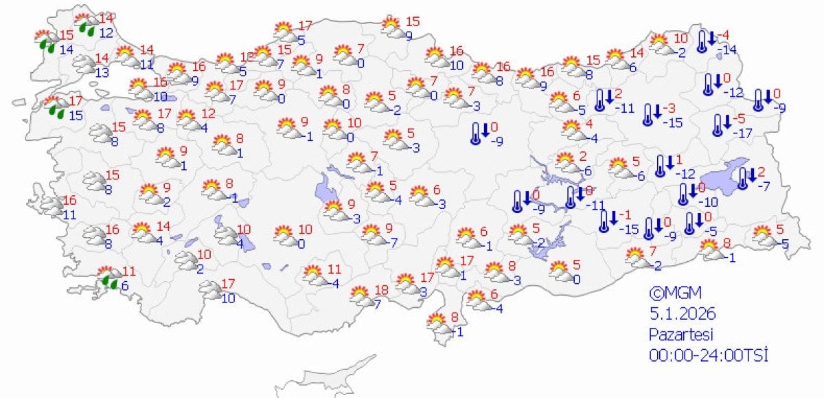 Marmara ve Ege'de sıcaklıklar 15-18 dereceye çıkarken, iç Anadolu'da 5-10 derece civarında, doğuda ise sıfırın altında seyredecek.