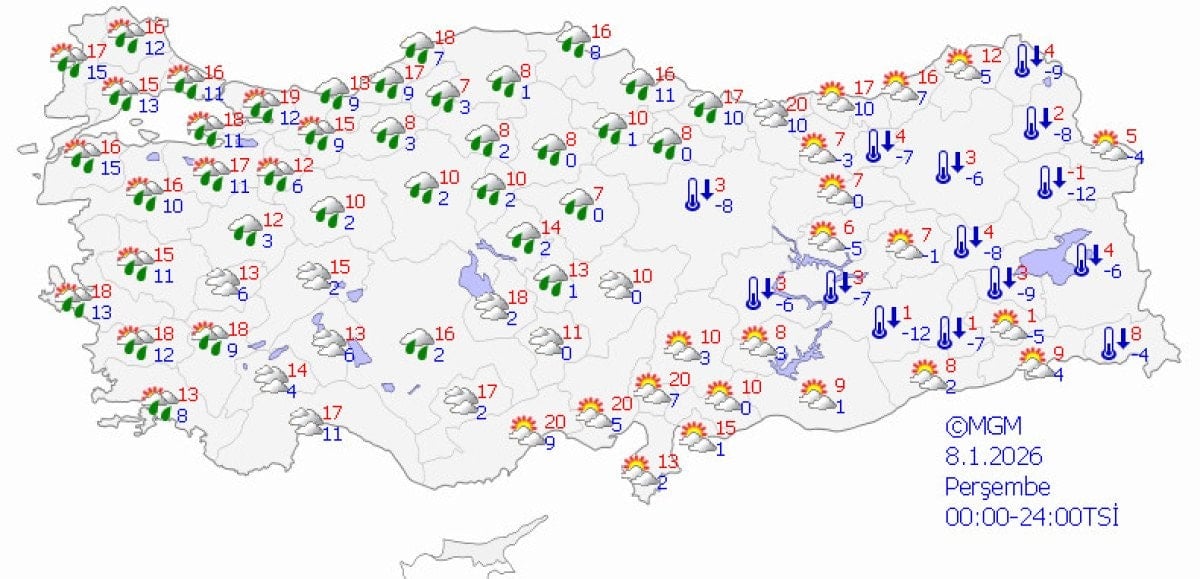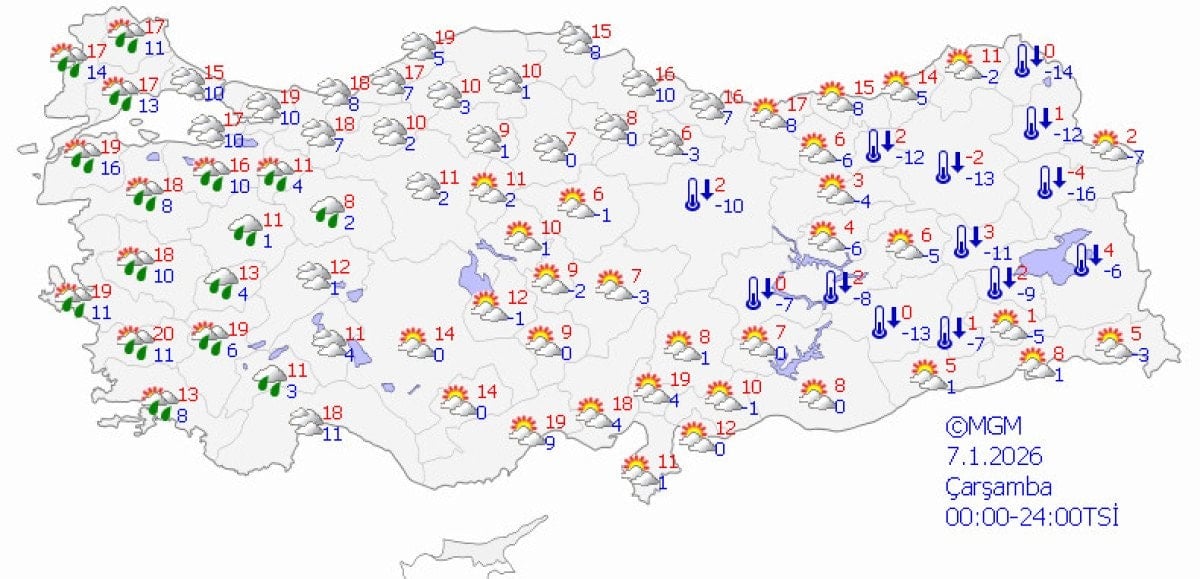Kıyı şeridinde 15-20 derecelere yaklaşan sıcaklıklar öngörülürken, iç kesimlerde 10 derece civarı, doğuda -10 derecelere varan soğukların sürmesi bekleniyor.