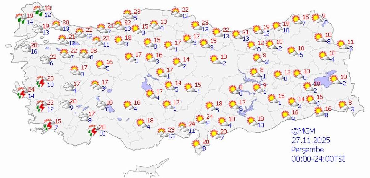27 Kasım Perşembe günü Marmara ve Ege'de parçalı bulutlu, iç ve doğu bölgelerde kar yağışlı hava sürecek.