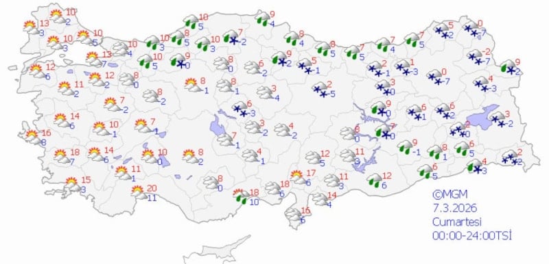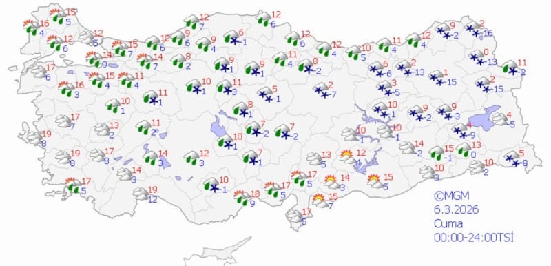 Meteoroloji Genel Müdürlüğü'nün (MGM) son verilerine göre ülke genelinde parçalı bulutluluk, yağmur, karla karışık yağmur ve yer yer kar yağışları bekleniyor.