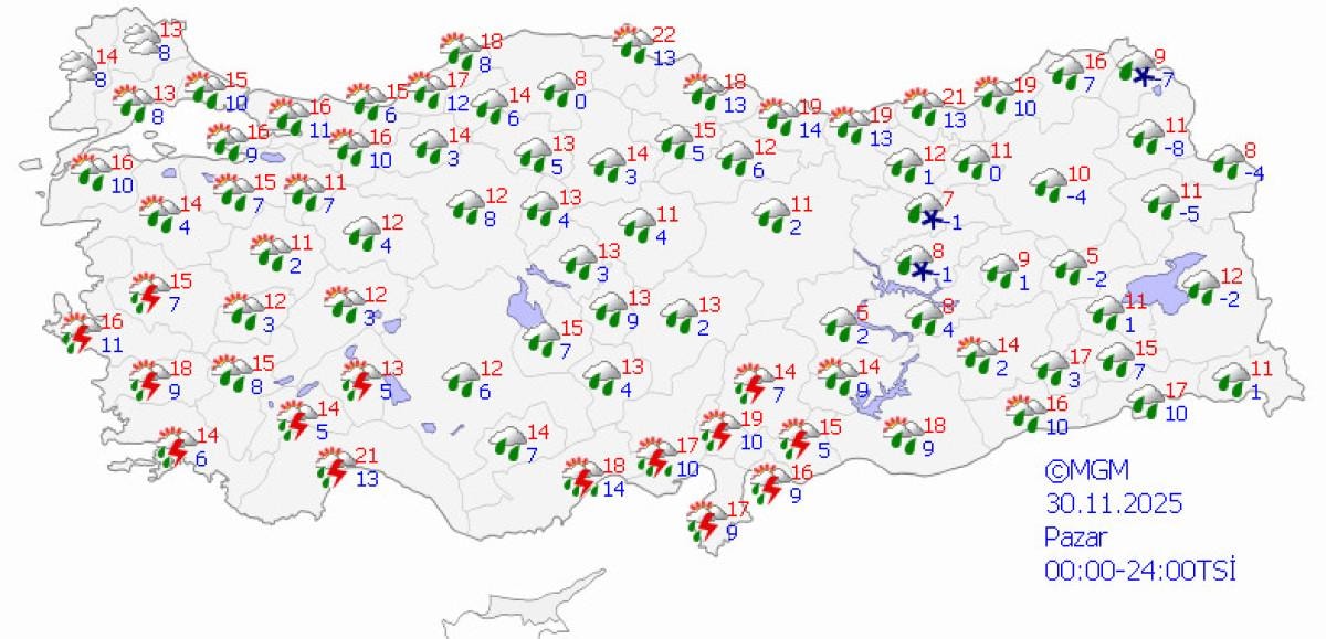 - Batı ve iç bölgelerde sağanak yağış beklenirken, 14 doğu ilinde kar yağışı öngörülüyor.