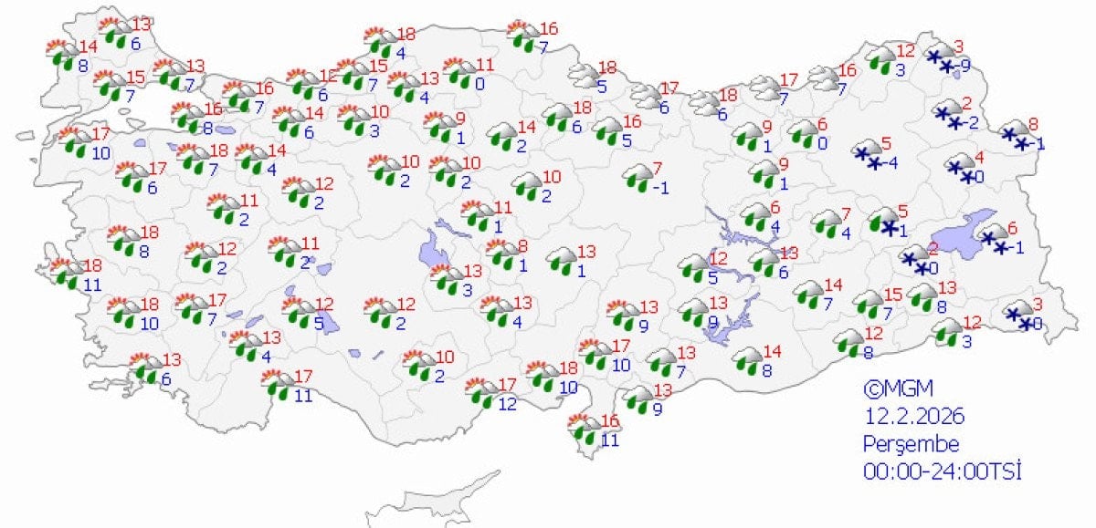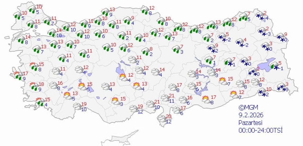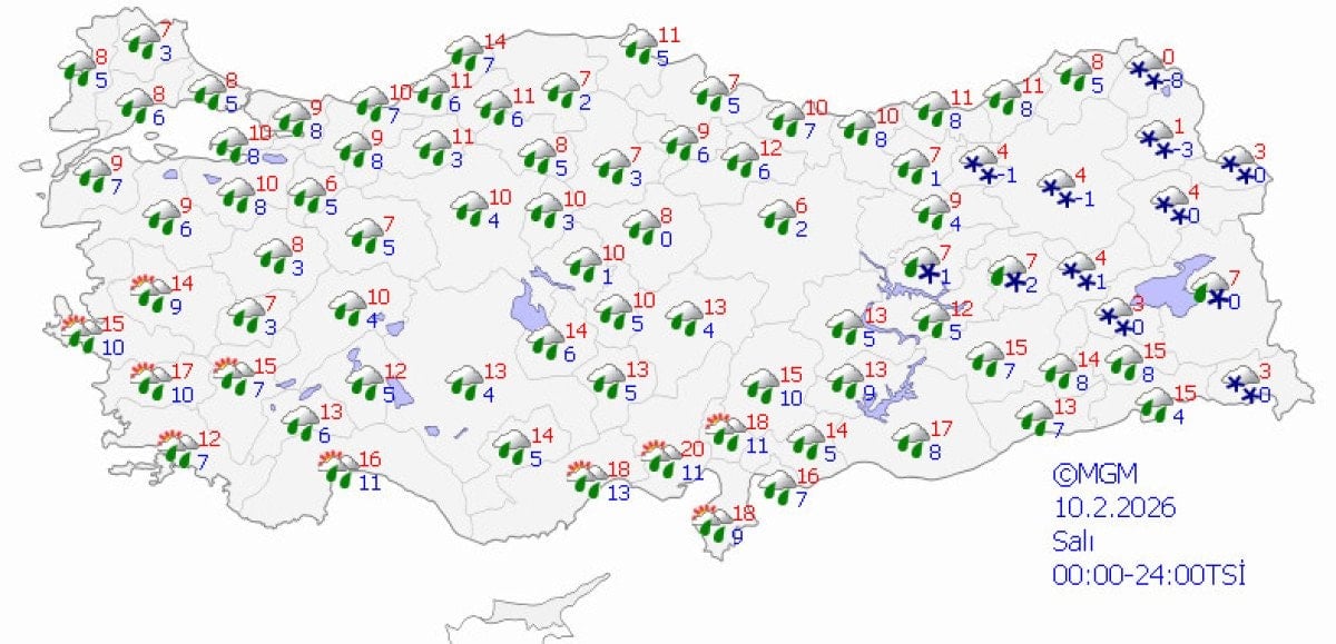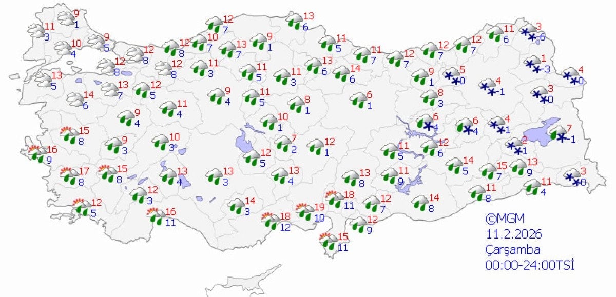 - Marmara ve Karadeniz'de parçalı bulutlu hava, Doğu ve Güneydoğu Anadolu'da ise yağmur ve karla karışık yağmur bekleniyor.