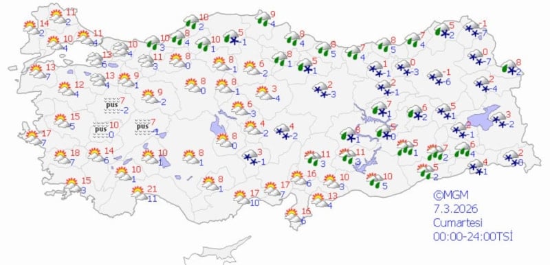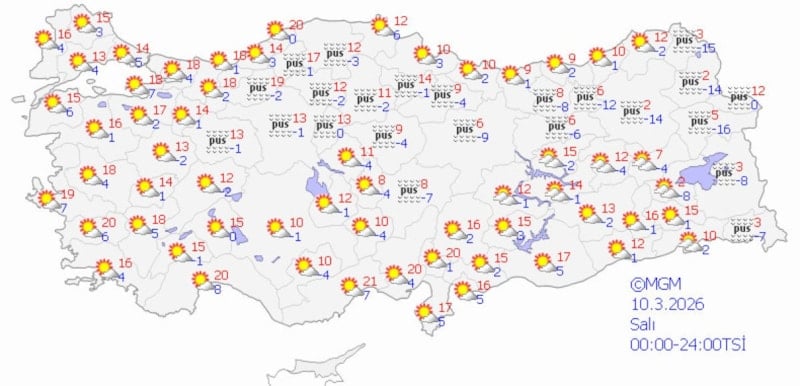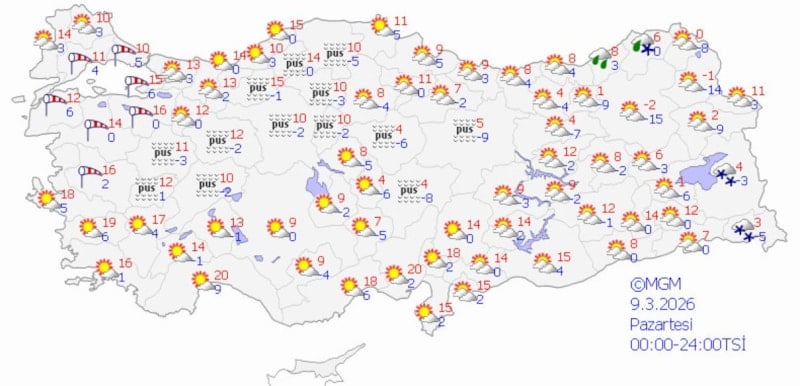 MGM'nin son verilere göre ülke genelinde havanın bulutlu olması ve iç kesimlerde yoğun pus bekleniyor. Yağışların genellikle kuzey, iç ve doğu bölgeleri etkileyeceği, sıcaklıklar ise mevsim normallerinin altında seyredeceği değerlendiriliyor.
