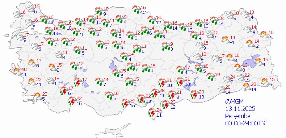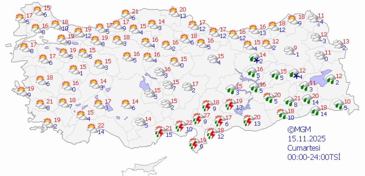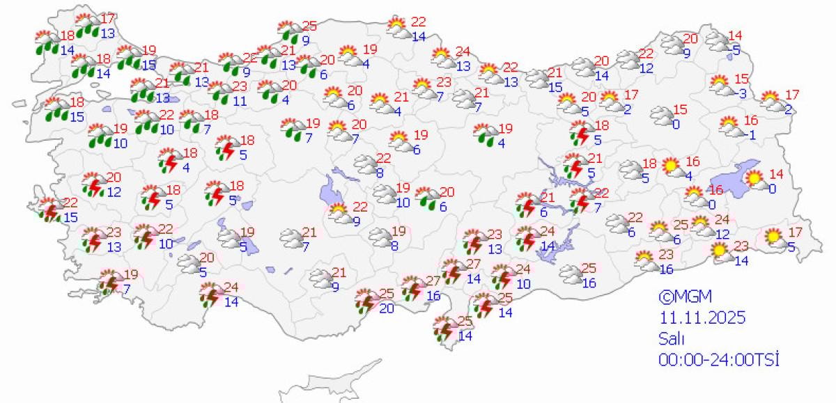- Batı ve güney illerinde sıcaklıklar 25 dereceye çıkarken, doğu illerinde serin bir hava var.